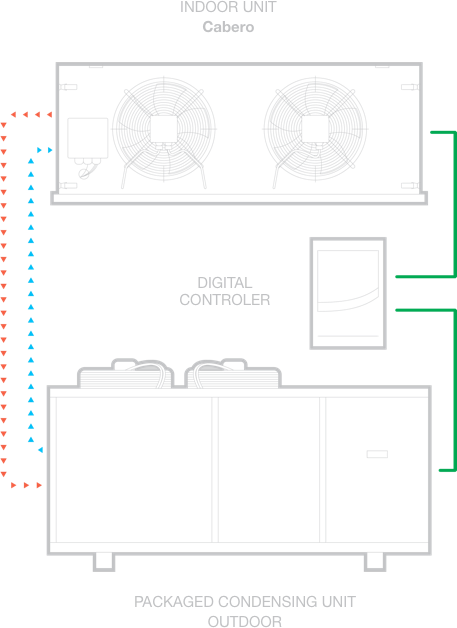 The control system is integrated into all three components of the system enabling real time adjustments to maximise the coefficient of performance (COP). Suction and condensing pressures float to minimise energy input while providing very stable room temperature control.