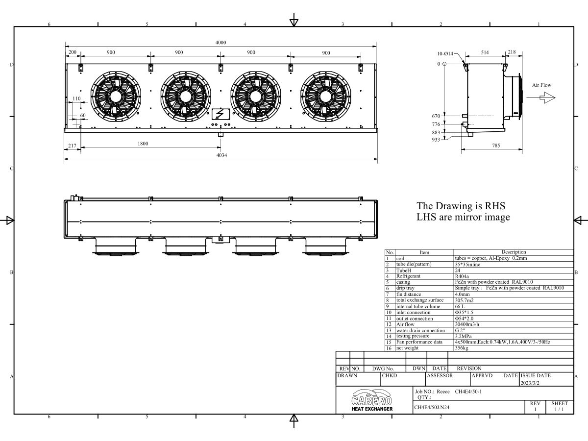 Cabero CH series evaporators are typically used in walk-in cool and freezer rooms with ceiling heights of 2 metres or more and 500mm fan models with ceiling heights of 3 metres or more. CH evaporators are commonly used in in fast food outlets, butchers shops, fruit and vegetable shops and general purpose coolrooms and freezers. Plentiful air movement is provided by the quiet and efficient 300, 350 and 500mm external rotor fan motors to reach all the products in the refrigerated space. The design combination of induced draft air flow, larger distance between the fan and coil face and the air bypass panel provides very good air throw to reach all corners of the room. CH evaporators are fully wired to reduce installation time and the easy to fold down drip tray allows for quick and easy internal cleaning and on the low temperature models for maintenance of the drip tray defrost heater/s. All Cabero CH evaporators use blue fin coating and 12mm smooth bore thick walled copper tubes to extend the efficient life of the evaporator. CH series evaporators are a good choice to clients wanting to maximize product quality and storage life.