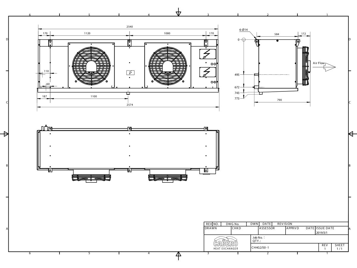 Cabero CH series evaporators are typically used in walk-in cool and freezer rooms with ceiling heights of 2 metres or more and 500mm fan models with ceiling heights of 3 metres or more. CH evaporators are commonly used in in fast food outlets, butchers shops, fruit and vegetable shops and general purpose coolrooms and freezers. Plentiful air movement is provided by the quiet and efficient 300, 350 and 500mm external rotor fan motors to reach all the products in the refrigerated space. The design combination of induced draft air flow, larger distance between the fan and coil face and the air bypass panel provides very good air throw to reach all corners of the room. CH evaporators are fully wired to reduce installation time and the easy to fold down drip tray allows for quick and easy internal cleaning and on the low temperature models for maintenance of the drip tray defrost heater/s. All Cabero CH evaporators use blue fin coating and 12mm smooth bore thick walled copper tubes to extend the efficient life of the evaporator. CH series evaporators are a good choice to clients wanting to maximize product quality and storage life.